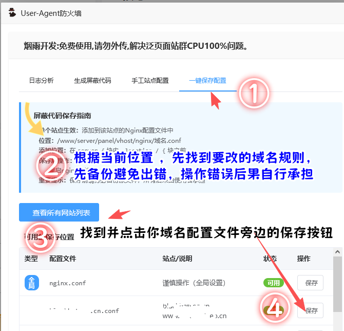为了方便操作,给客户免费开发一款宝塔 nginx环境防护插件,用于批量扫描日志里出现的蜘蛛User-agent 以及自动生成屏蔽规则,和一键添加到站点配置规则里。